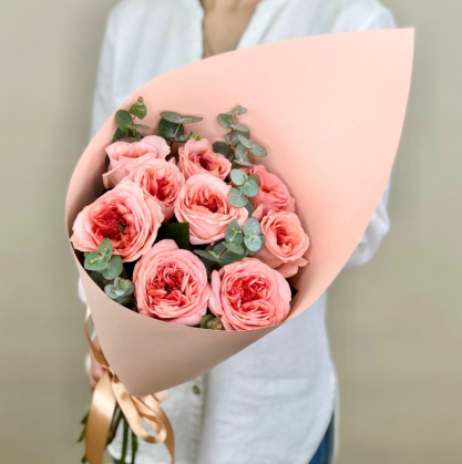 Пионовидные розы с добавлением эвкалипта в стильном оформлении.